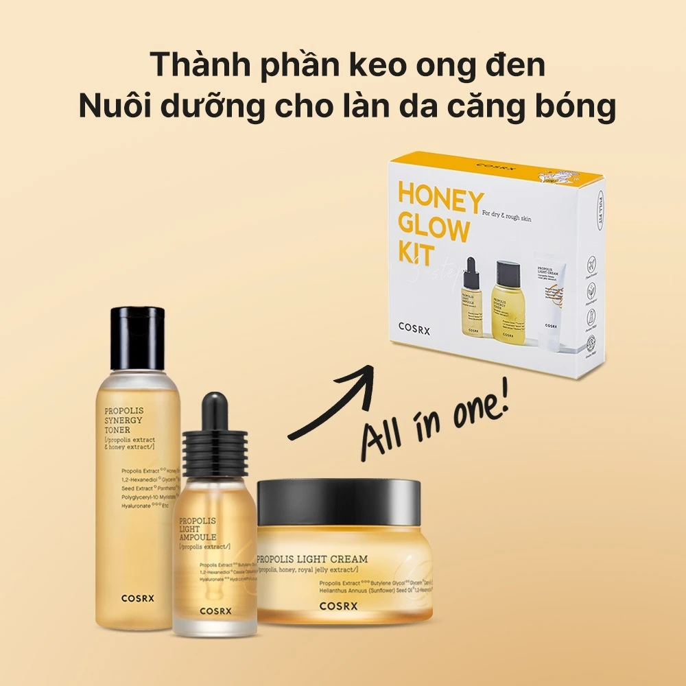 The kit includes 30ml toner + 10ml essence + 15ml cream.Products containing black propolis extract, honey extract and royal jelly extract with anti -inflammatory and antibacterial properties;At the same time also provides nutrients and antioxidants giving you a soft and firm skin.Light liquid gel cream has 65.69% propolis, easily penetrated into the skin.The kit includes all the basic skincare products you need.
