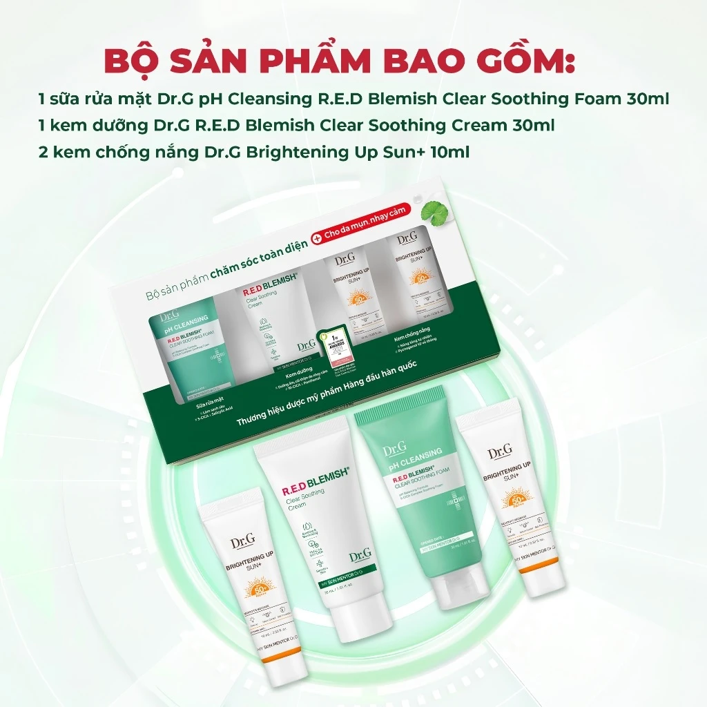 Dr.G's skincare sets are added 2 tubes of small sunscreen, helping to protect the skin in the intense sunlight of summer.Besides, the kit also has a cleanser and cream to help you clean the skin and moisturize.In addition, the product also soothes skin condition, itching, inflammation caused by acne, improves the skin fence and takes the skin back to a healthy state, thereby limiting irritation or acne.
