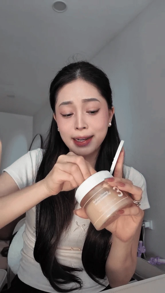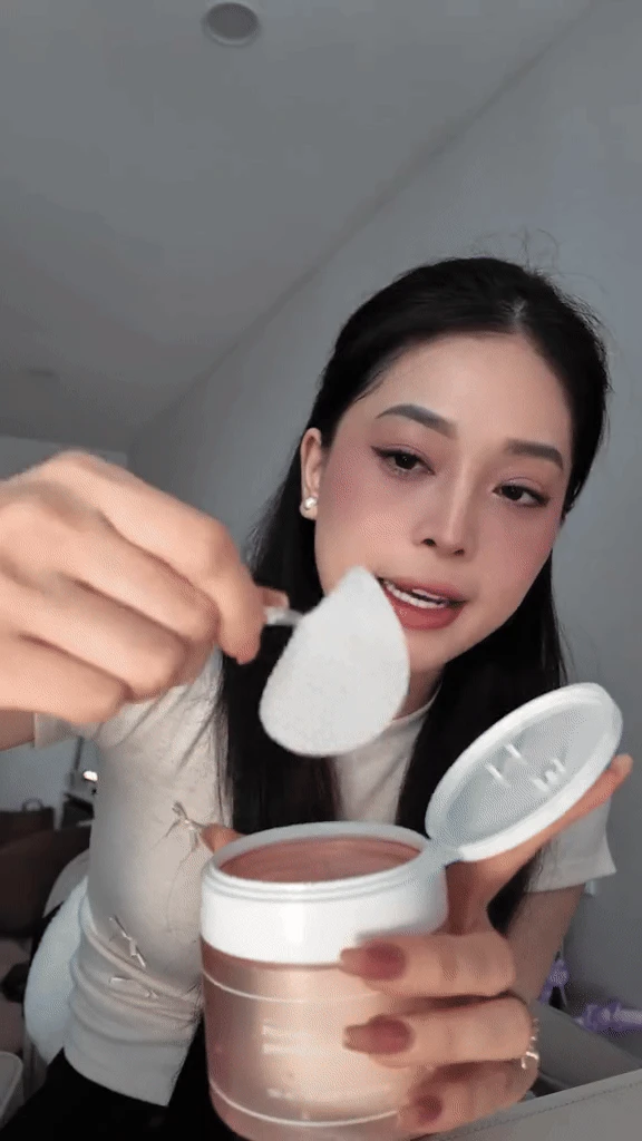 First of all, the runner used the jelly structure first to provide moisture and then she turned over the rippling design to gently exfoliate the skin.According to Phuong Nga, the product containing phase has the effect of exfoliating but lighter than AHA/BHA, so her sensitive skin can also be assured to use.Regarding the effectiveness of lightening will not instant immediately but if persevered in use, women will see the skin brighten over time.