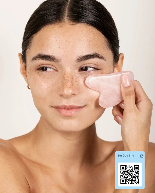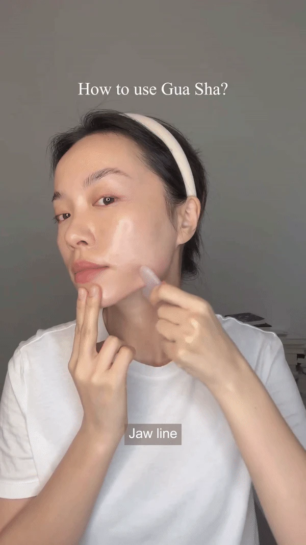 Specifically, Ha Truc shared tips to use Gua Sha easily is to apply a thick layer of moisturizer (or moisturizing oil).After that, proceed to massage gently, relaxing from the jaw contour, chin chin, groove, around the eyes, forehead, temples, acupuncture points.Each movement should be done 15-20 times to achieve the best effect.