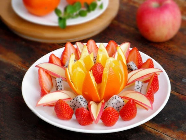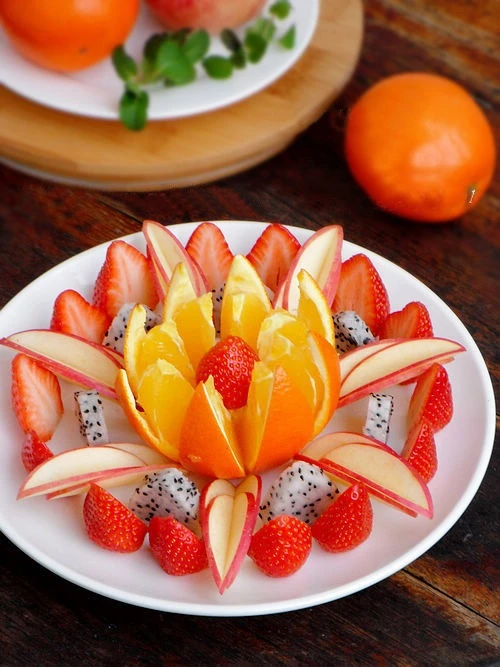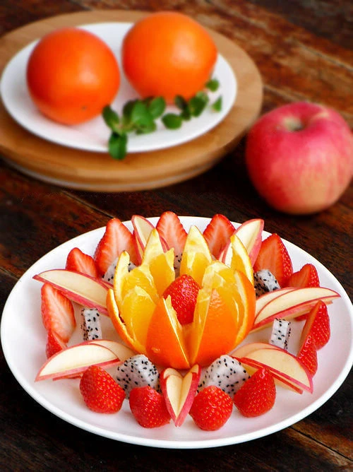 Arrange the apple slices together and staggered the length to form a stylized petal.You start arranging flowers as follows: Put the orange in the middle of a large bright disc color.The "apple petals" spread around the orange.Alternating between each "apple petals" are two "strawberry petals" standing.The whole strawberry is placed neatly between the orange zone. |
