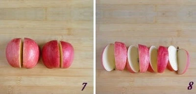 |  Apples should leave the skin to eat crispy fragrant.You add apples to make 8 parts evenly, use 7 parts, reduce 1 part.Soak the apples in light salt water for a few minutes and then flutter.Add the apple into the V -slices in two walls of each piece of apples, the V -slices inside will be smaller than the outside.