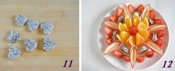 To display more dragon fruits, you cut the dragon fruit into thin slices of nearly 1cm.Use a food cutting mold to cut dragon fruit into a heart shape.Arranging "heart -shaped petals" from dragon fruit to the middle of apples and strawberries.