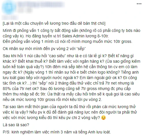 “I went to interview a real estate company.They posted the Sales Admin position Luong 8-10 million.When I interviewed, I made it clear that I wanted 10 million Gross.Ok personnel invite me to interview for the second round with the boss.