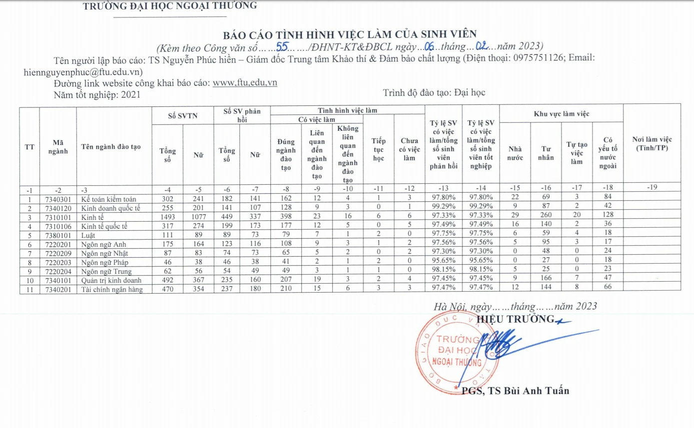 First is for the schoolForeign Trade University,according to"Student employment situation report"In the 2021 graduation year, the percentage of FTU graduates with jobs lies at a very high threshold: 95.65% - 99.29%.