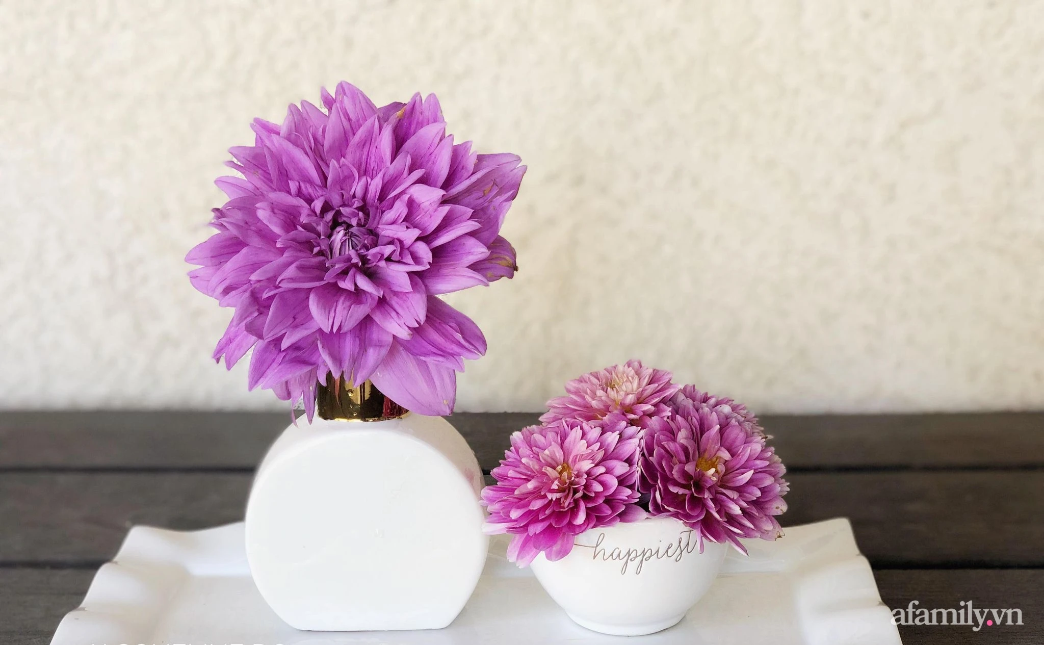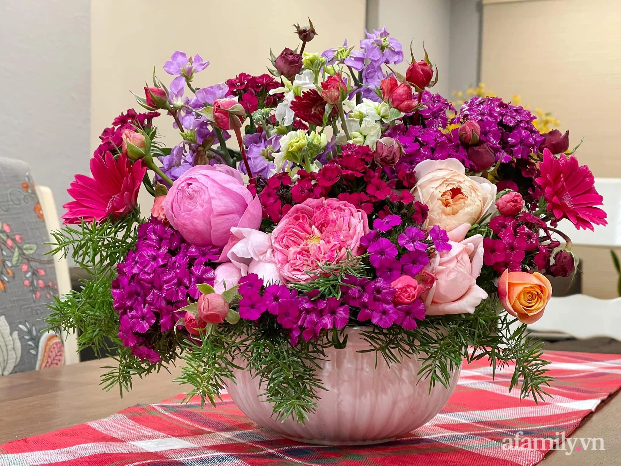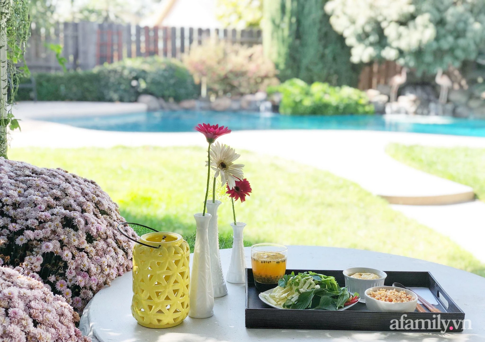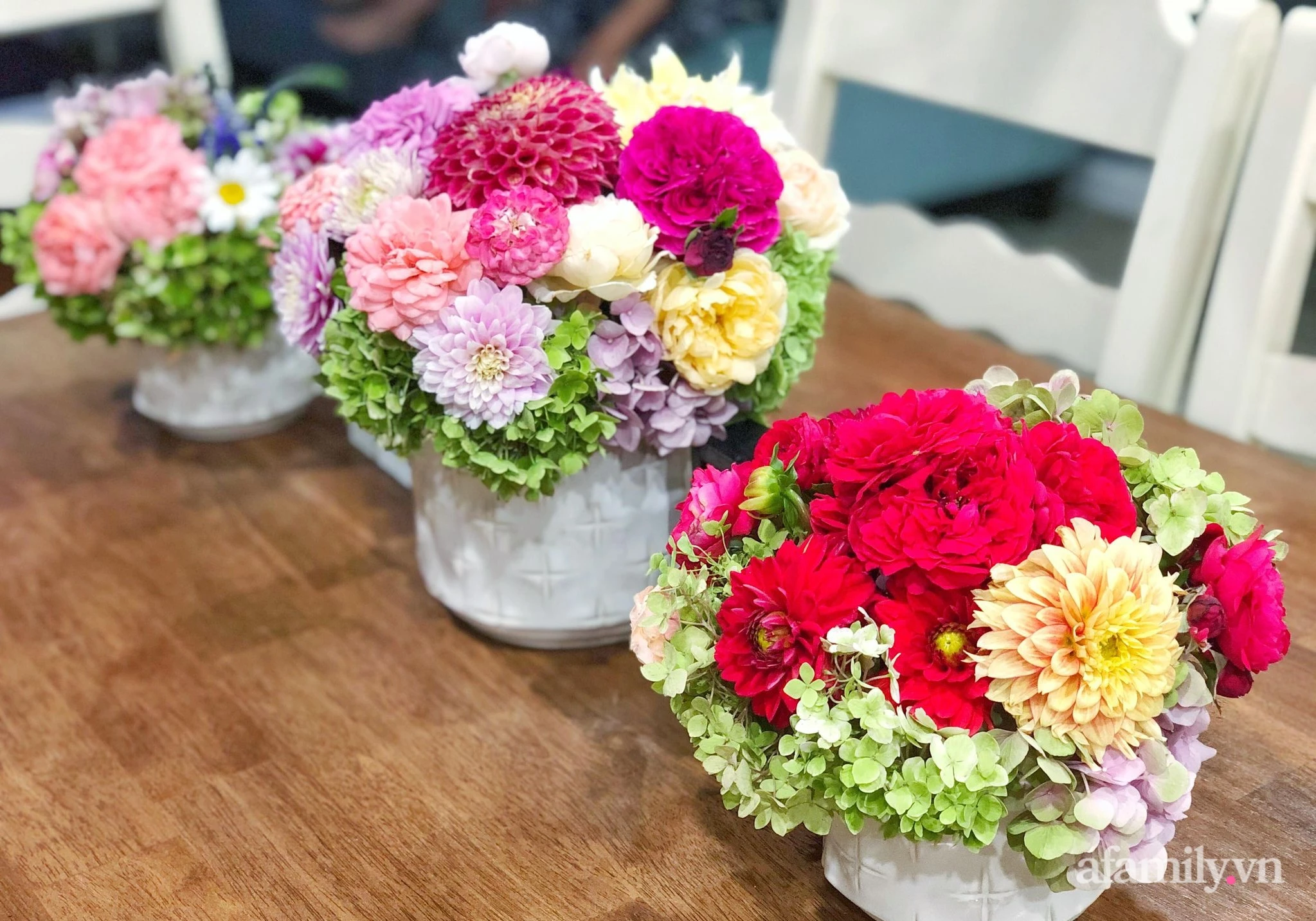 Not only owns the 800m2 garden with all kinds of flowers all year round, her skillful hands and sophisticated aesthetics also take the time to take care of the home with beautiful, beautiful vases.