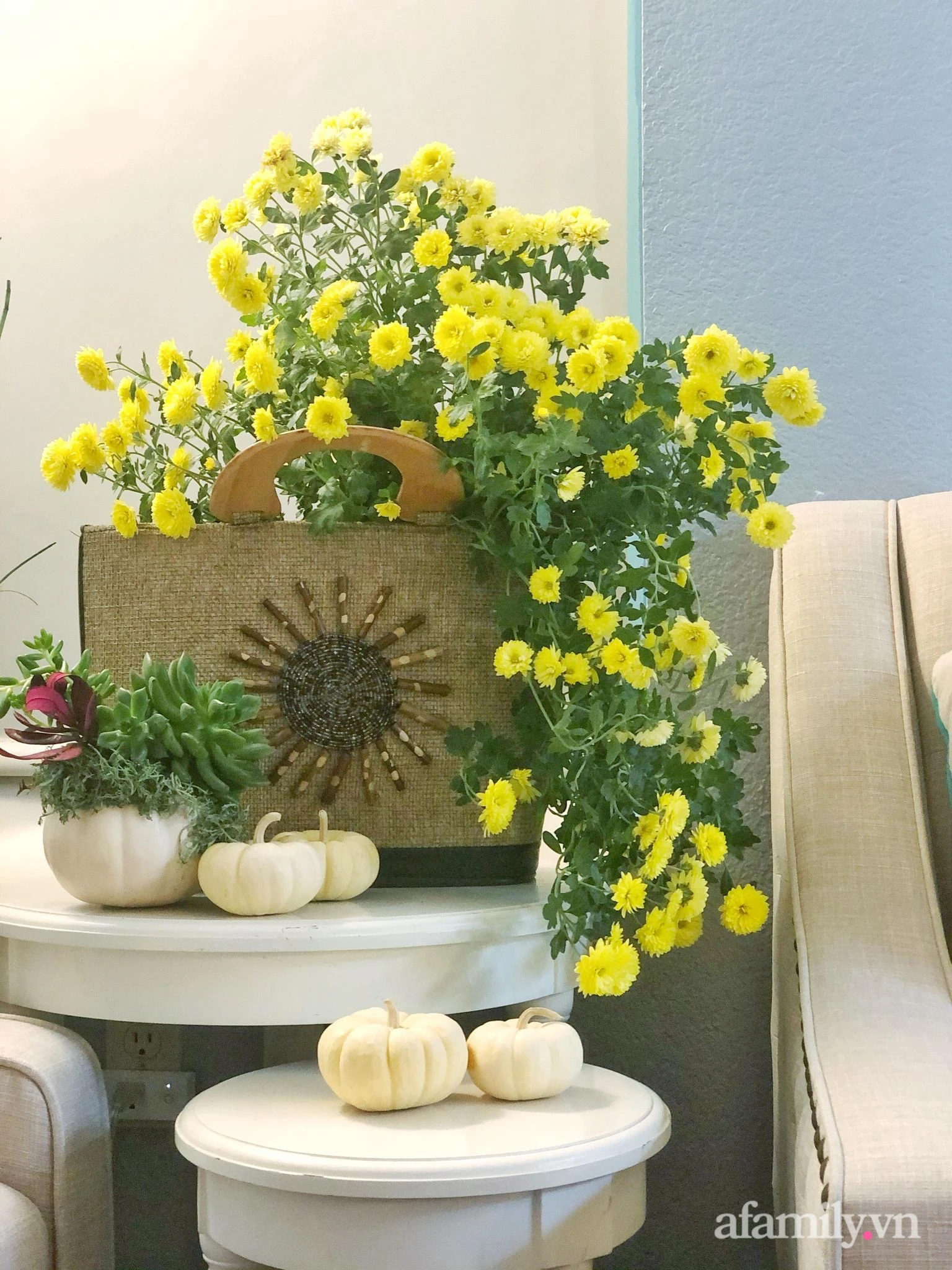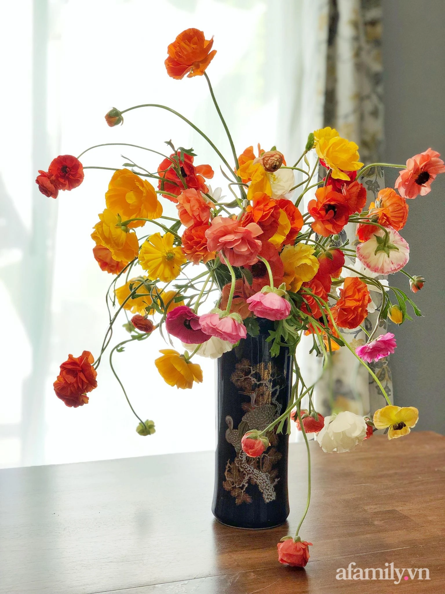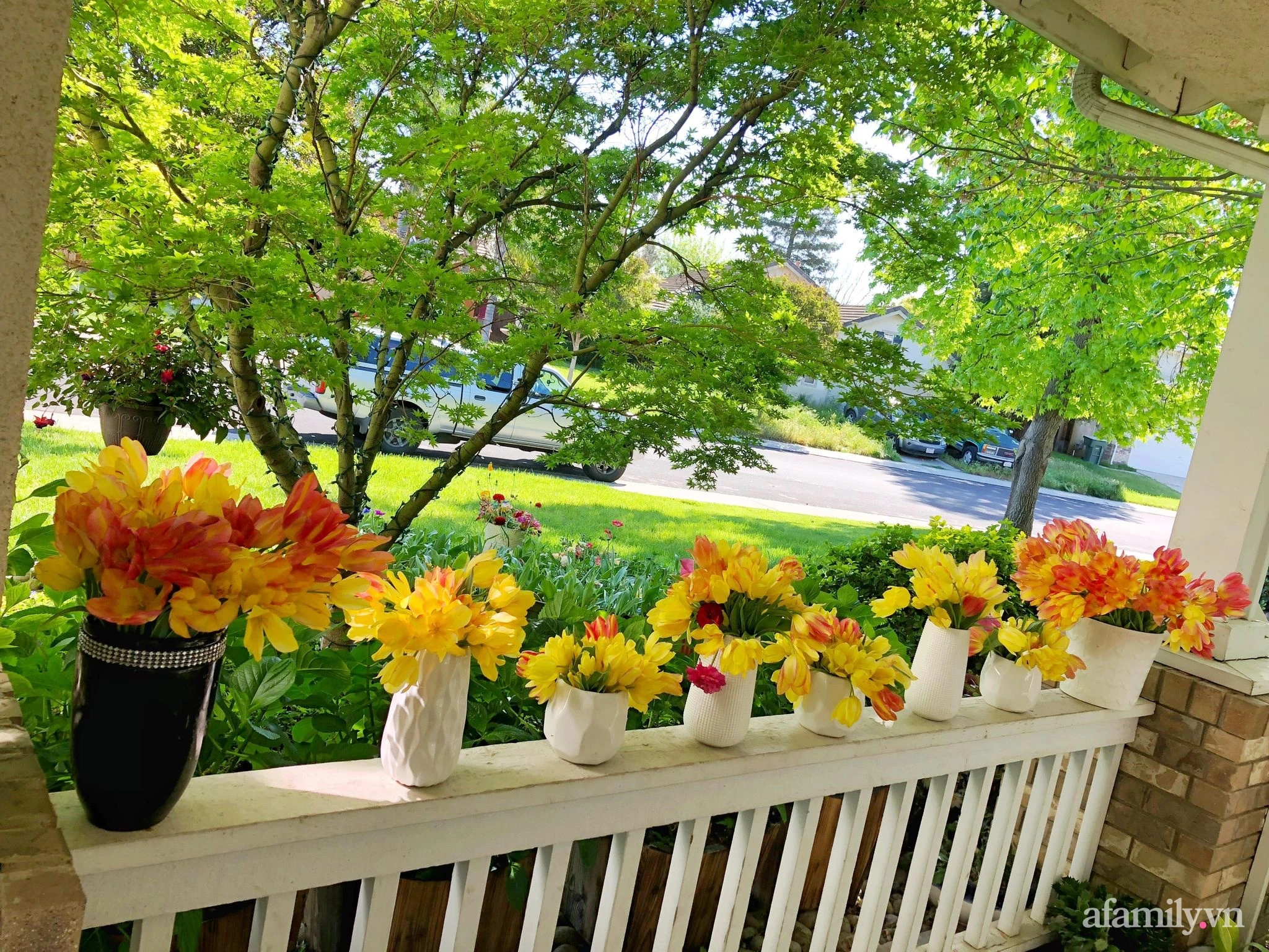 Not only owns the 800m2 garden with all kinds of flowers all year round, her skillful hands and sophisticated aesthetics also take the time to take care of the home with beautiful, beautiful vases.