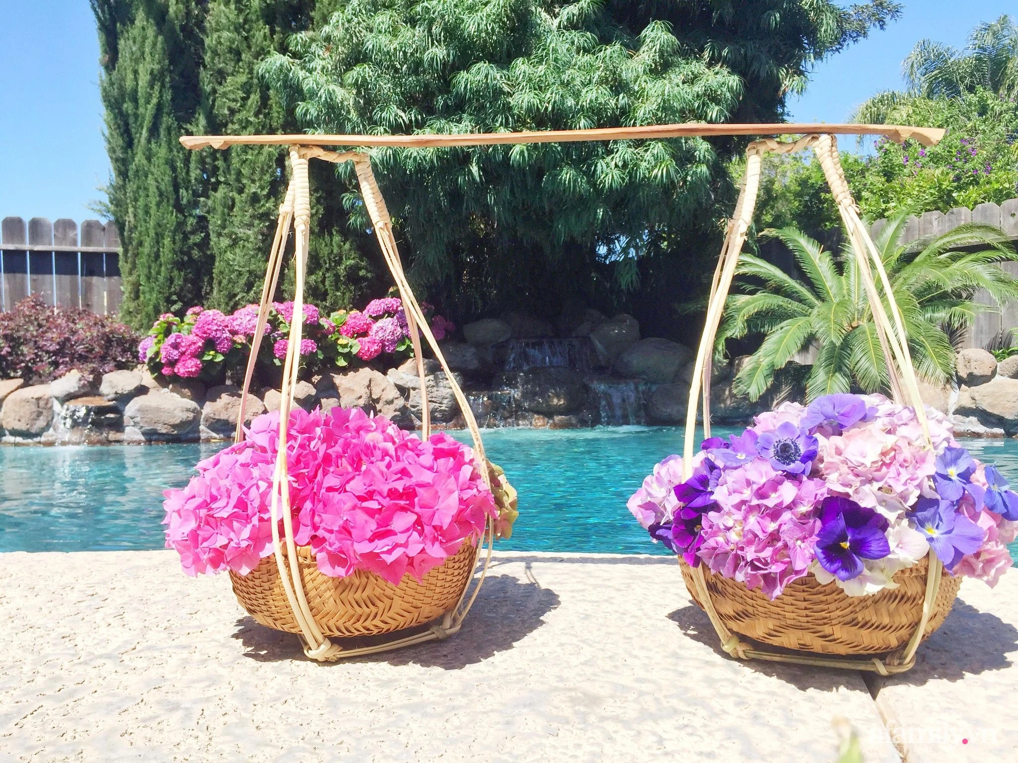 The "flower burden" is located next to the pool.