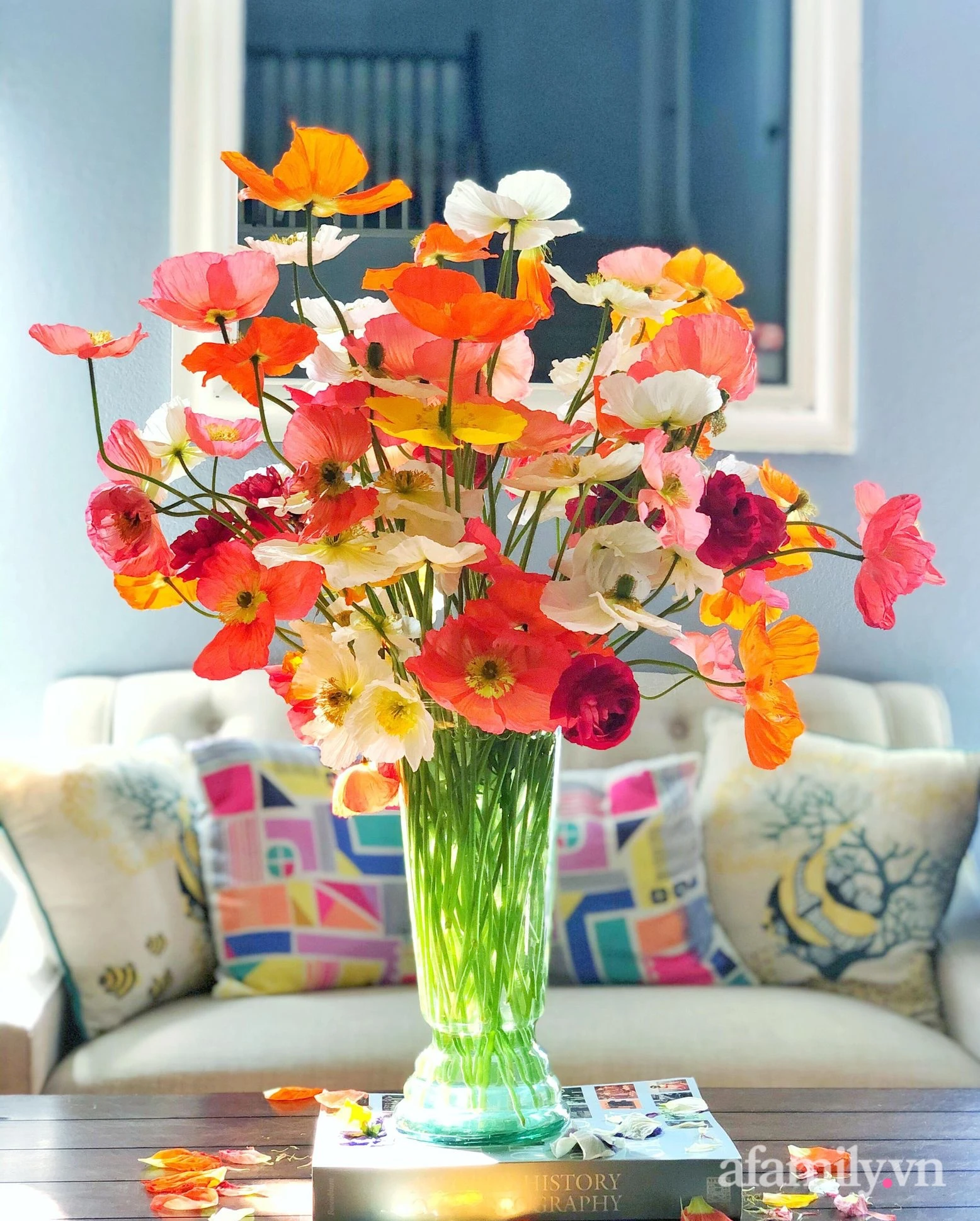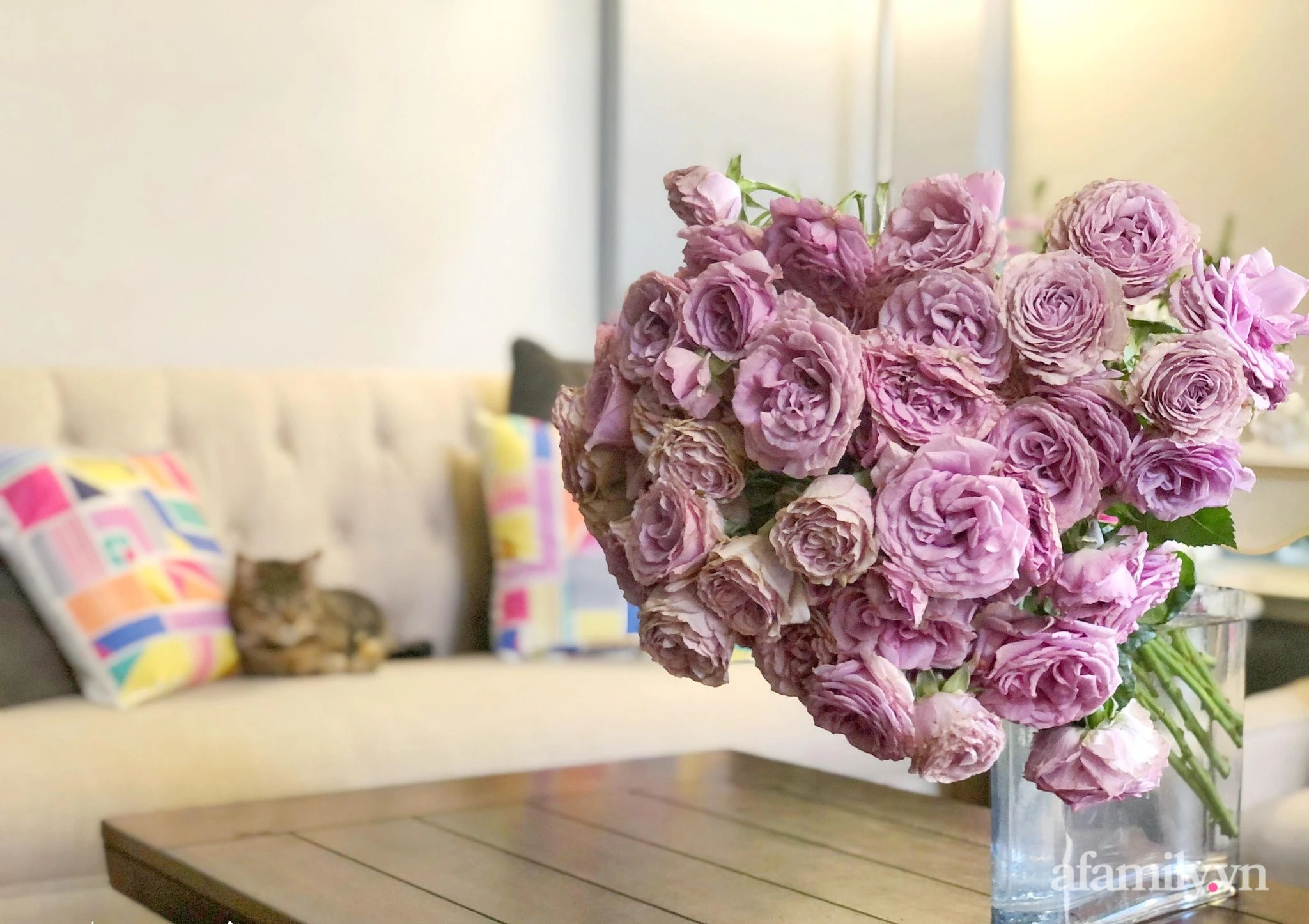 Brilliant roses beautify the living room space of the family.