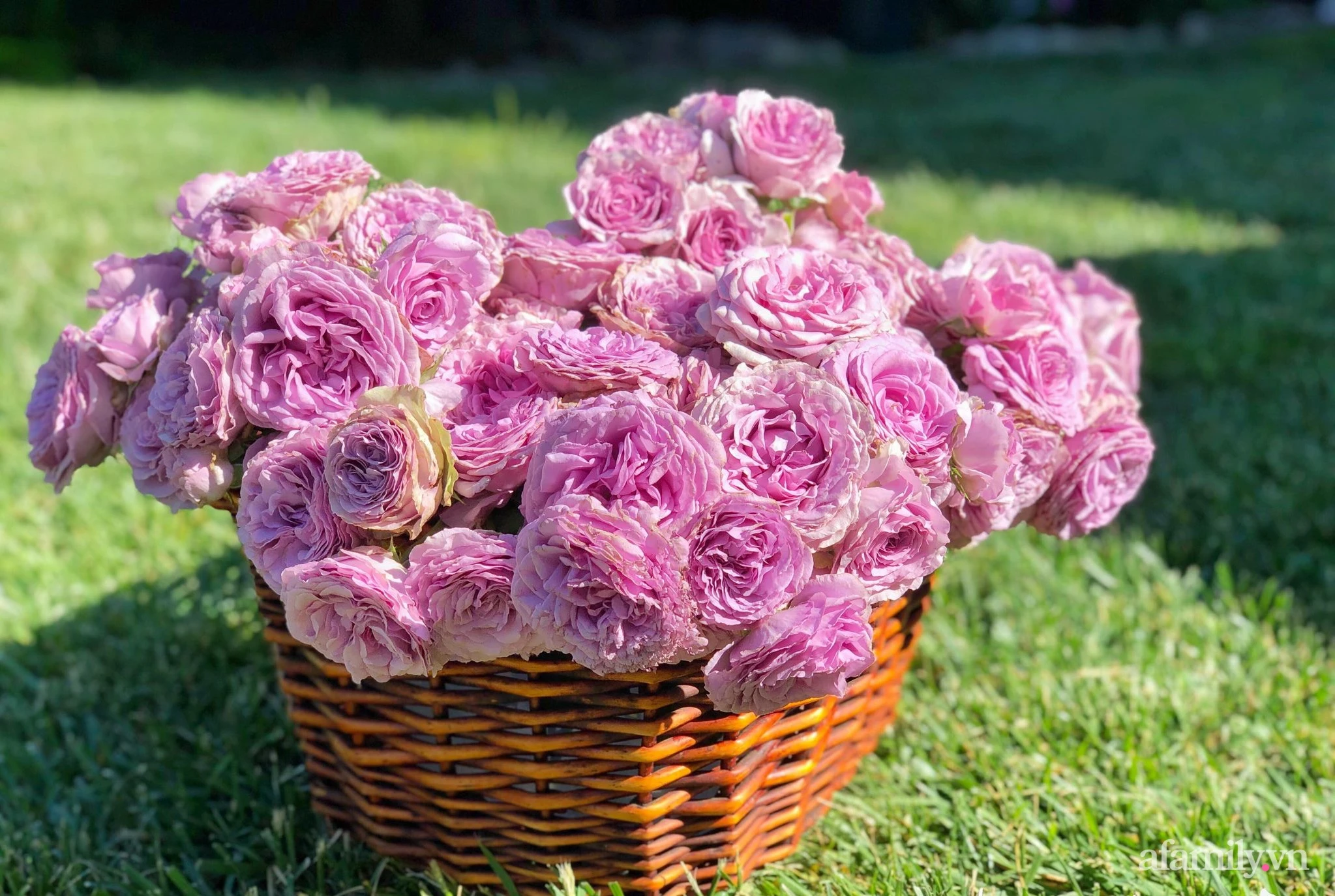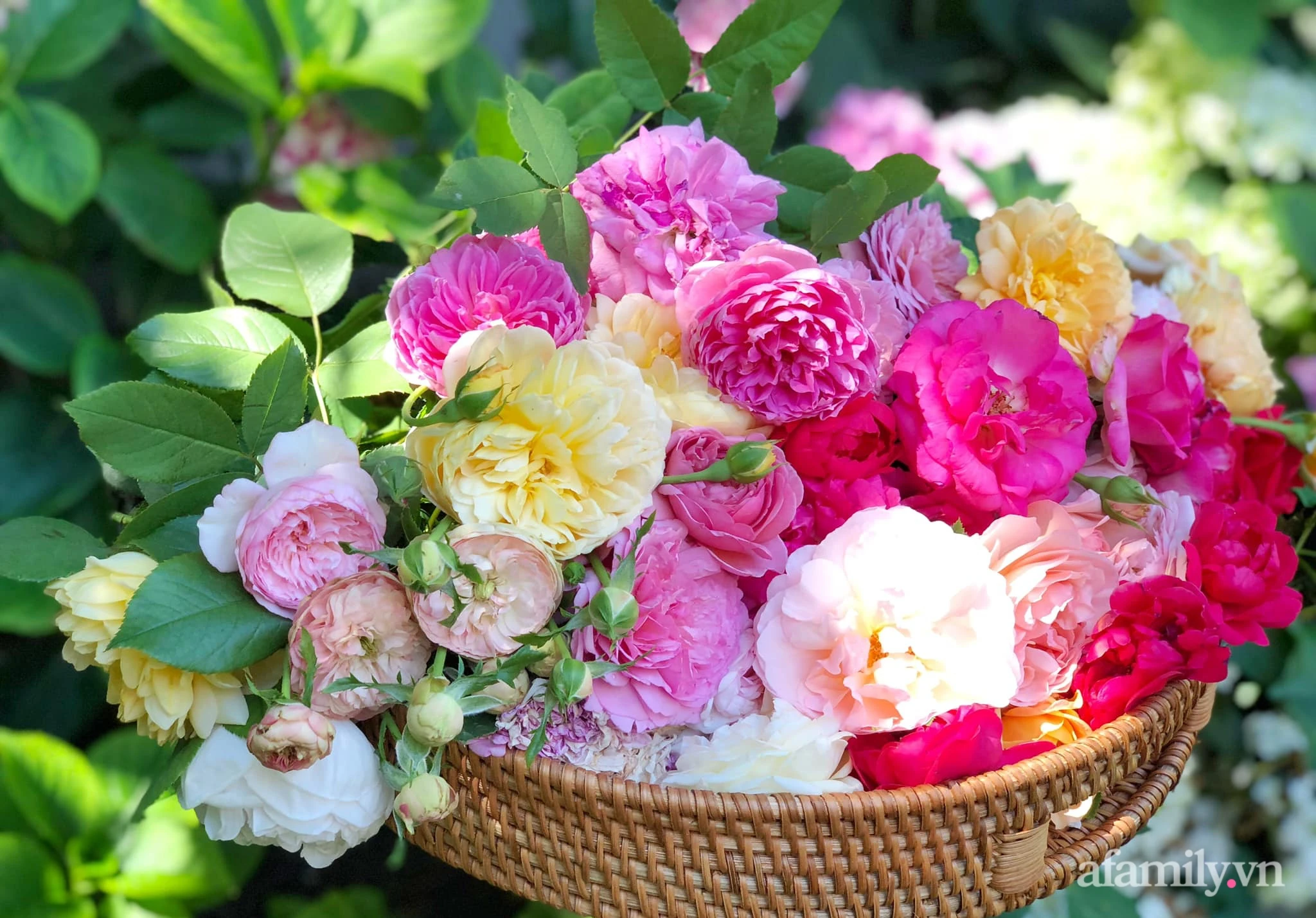 Rattan basket plugged the newly cut roses.