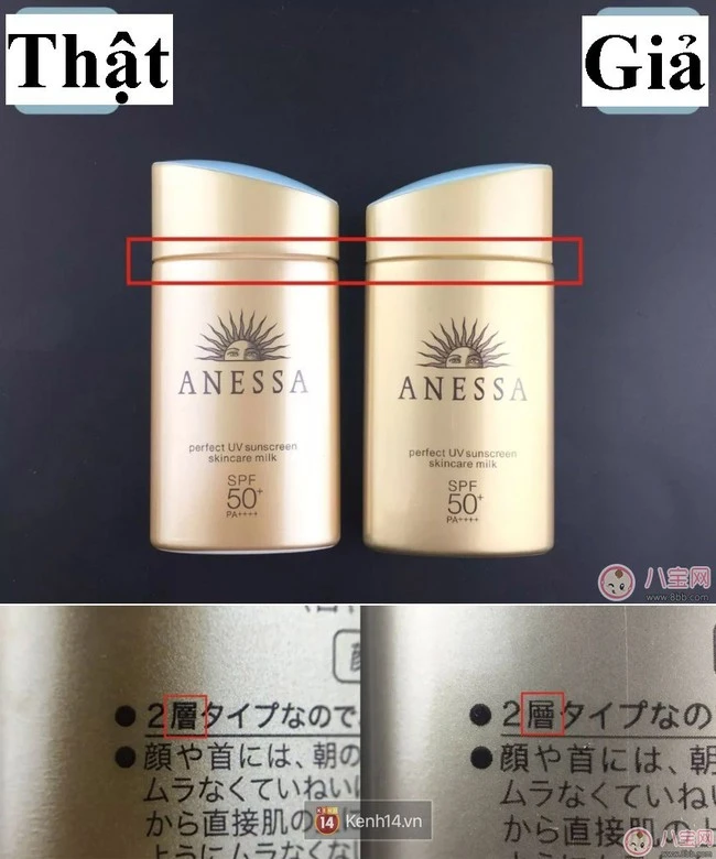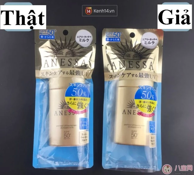 The genuine packaging is imprinted with a dark yellow Anessa word, the fake goods are turned white due to the use of poor quality packaging.